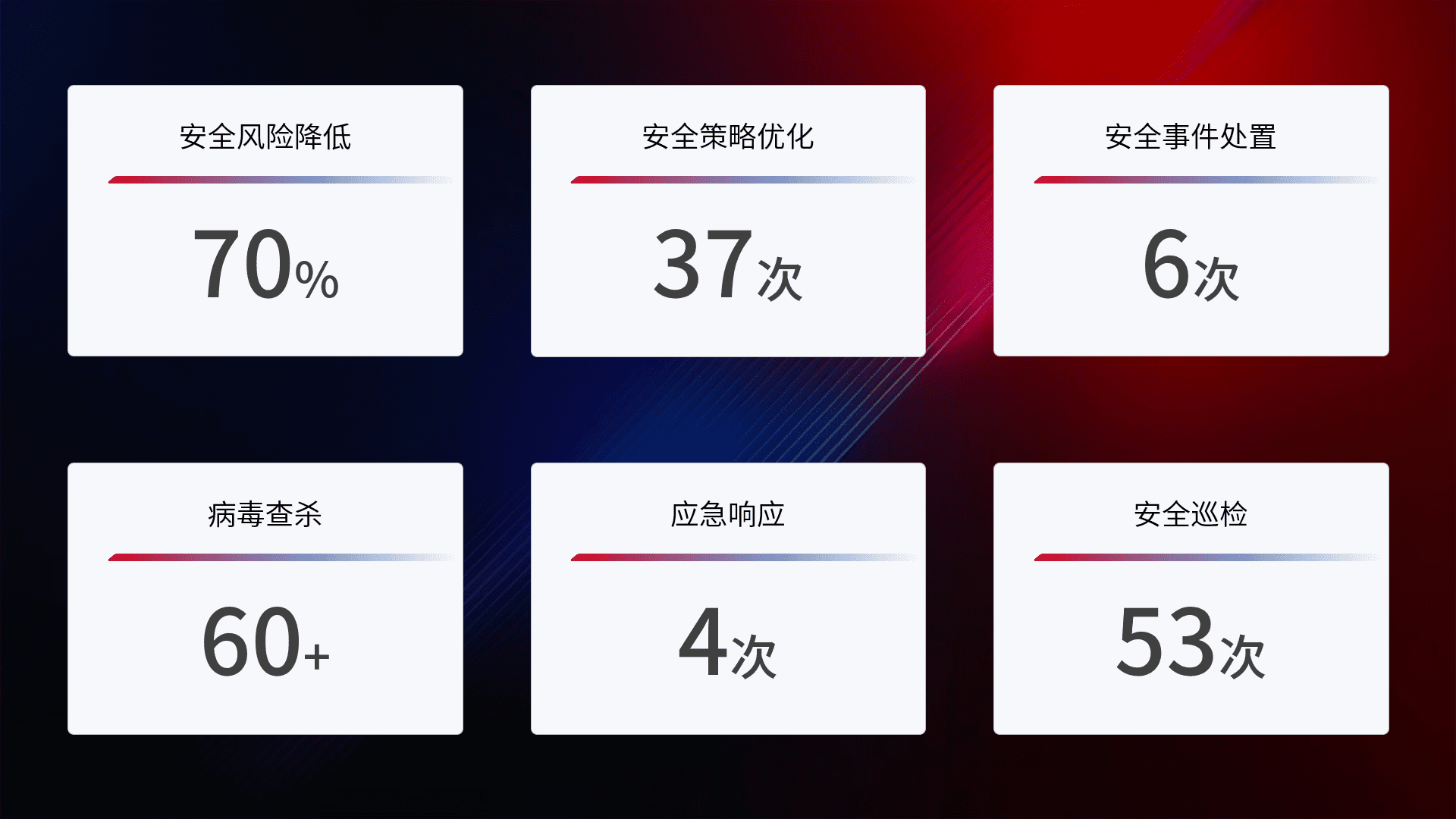提供全面的安全事件报告体系,,,包括处置报告、、周报、、、、季度和年度总结,,,结合持续监控,,帮助客户深入了解网络安全状况。。。。