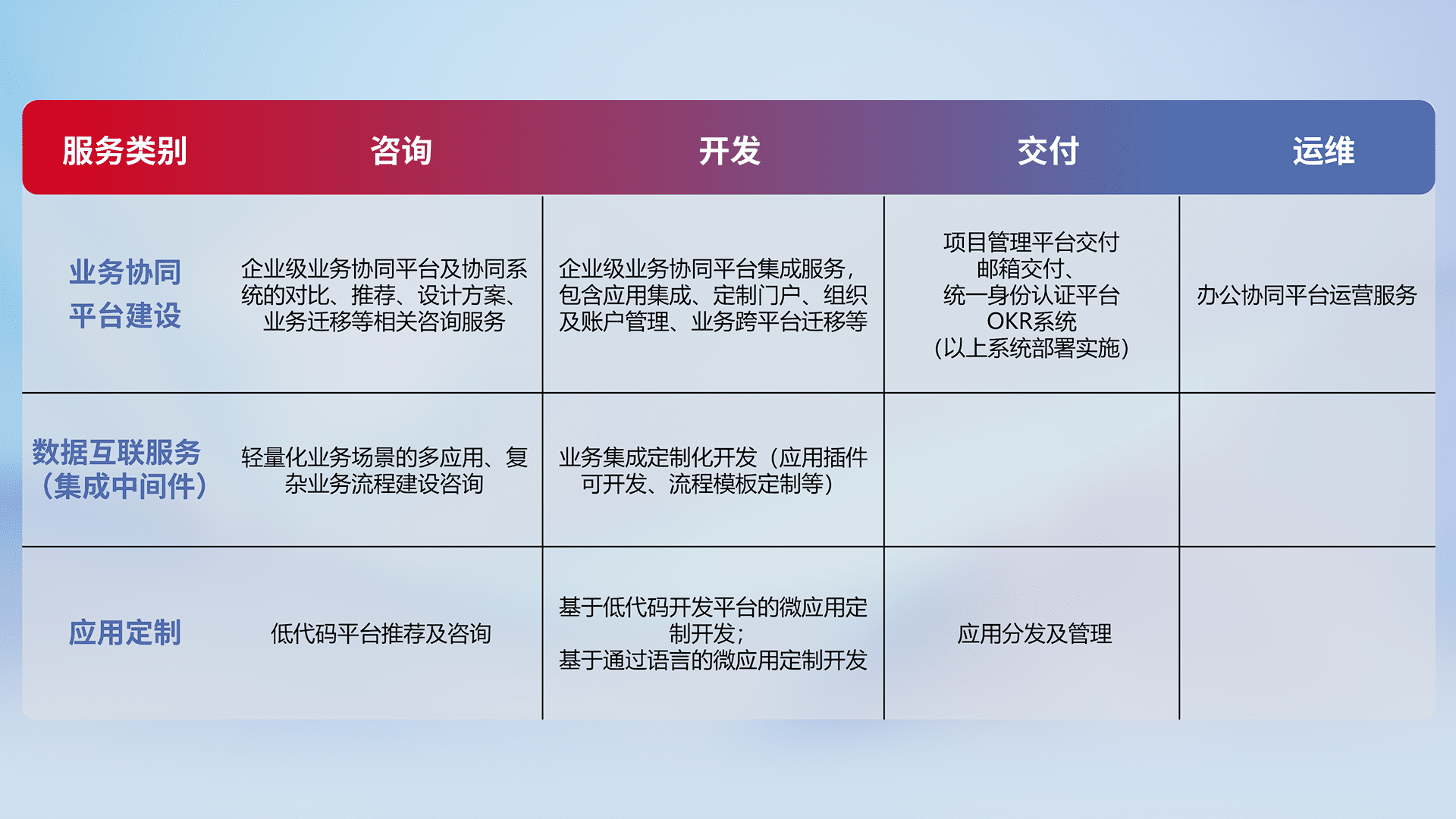 针对钉钉、、、企微、、IDaas等平台级产品提供产品的规划、、、、方案、、交付、、、定制化开发等服务,,,,实现如统一协同办公、、、、智能客户服务、、、混合会议管理、、、智能数据查询、、、等业务场景,,实现数字化转型。。
