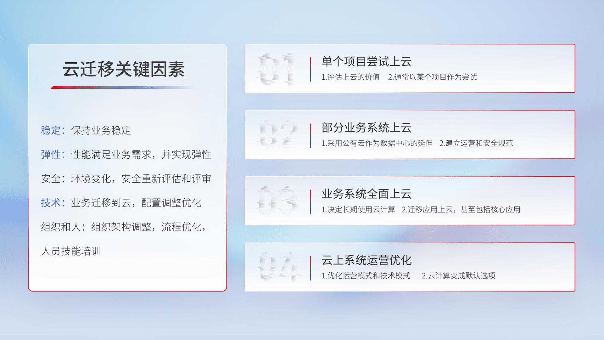 结合实际业务,,从规划设计、、、、云平台选型、、、云原生改造、、、数据迁移、、集成交付,,迁移全过程为客户识别最佳上云路径,,,,做好风险识别管理,,设计网络架构、、、身份权限、、安全审计合规、、操作审计、、、、日志审计、、监控告警策略、、、多站点容灾设计等,,,对云上基础设施进行整体规划,,提升IT治理水平,,,以满足弹性、、、高可用、、、高性能的需求。。