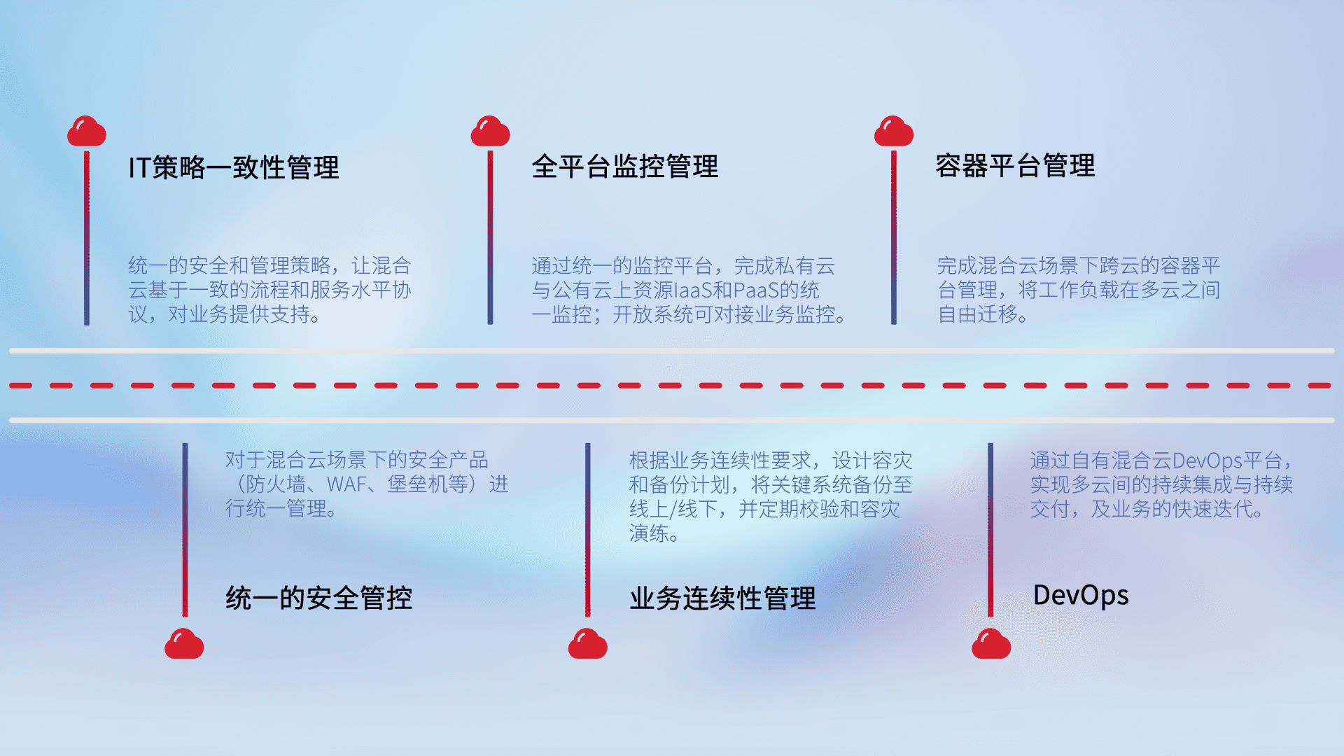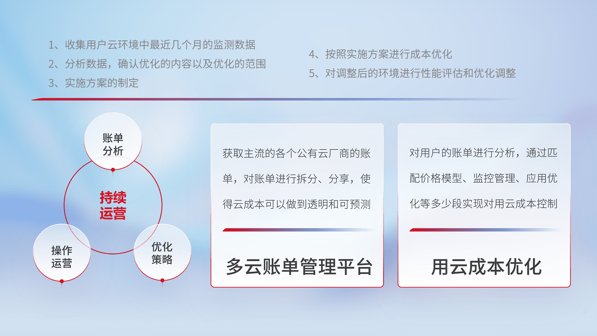 通过多云纳管,,以统一的资源数据模型把客户的云资源进行抽象和封装,,进而实现对多云资源的统一操作,,,,保障云资源管理的可靠性、、、稳定性与可用性。。。量身定制化运维内容,,配置、、、开发运维、、、补丁管理、、、备份、、、、监控、、、认证和访问管理、、、、审计和日常巡检等,,保障在用云过程中的可靠度,,,稳定度以及高可用率。。。。